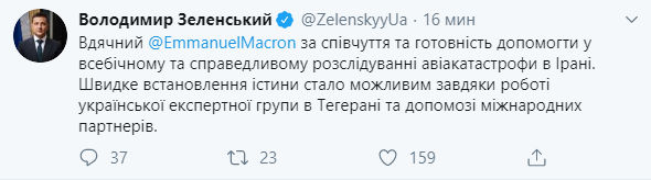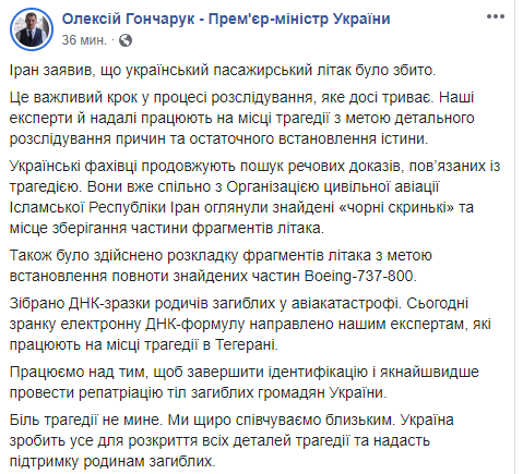 "Утро сегодня не было хорошим, но принесло правду. Еще до окончания работы международной комиссии Иран признал свою вину в сбивании украинского самолета. Но настаиваем на полном признании вины. Мы ожидаем от Ирана заверений в готовности к полному и открытому расследованию, привлечении виновных к ответственности, возвращении тел погибших,