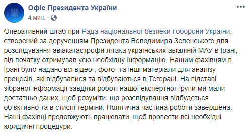 "Оперативный штаб при Совете национальной безопасности и обороны Украины, созданный по поручению Президента Владимира Зеленского для расследования авиакатастрофы самолета украинских авиалиний МАУ в Иране, от начала получал всю необходимую информацию. Нашим специалистам в Иране были предоставлены все видео-, фото- и другие материалы для анализа процессов, которые происходили и происходят в Тегеране. На основании собранной информации благодаря работе нашей экспертной группы мы имели достаточно данных, чтобы понимать, что расследование состоится объективно и в сжатые сроки. Политическая часть работы завершена. Наши специалисты продолжают работать, чтобы провести все необходимые юридические процедуры".