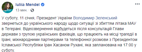 "В субботу, 11 января, президент Украины Владимир Зеленский обратится к украинскому народу касательно ситуации со сбитием самолета МАУ в Тегеране. Видеообращение состоится после консультаций главы государства с группой украинских специалистов, работающих на месте трагедии в Иране, международными партнерами и телефонного разговора с президентом Исламской Республики Иран Хасаном Рухани, которая запланирована на 17:00 в субботу".