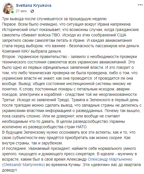 И последнее. Уважаемый президент, наймите себе нормального умного зрелого, пишущего и думающего пресс-секретаря. В идеале - мужчину в возрасте, каким был в своё время Александр Мартыненко  во времена Кучмы. Эти "девочки" вас до квартала доведут", - написала Крюкова.