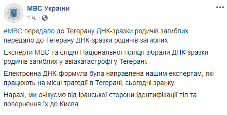 12:57 Министерство внутренних дел Украины передало в Тегеран ДНК-образцы родственников погибших в результате крушения самолета Boeing 737 авиакомпании "Международные авиалинии Украины" (МАУ) и ожидает от иранской стороны идентификации тел и возвращения их в Киев.