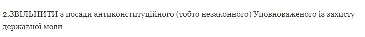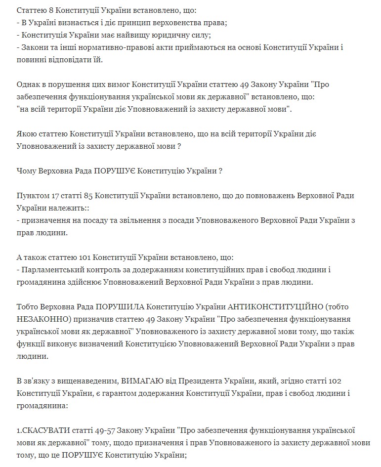 "...требую от Президента Украины, который, согласно статье 102 Конституции Украины, является гарантом соблюдения Конституции Украины, прав и свобод человека и гражданина: отменить статьи 49-57 Закона Украины "Об обеспечении функционирования украинского языка как государственного" относительно назначения и прав Уполномоченного по защите государственного языка, потому что это нарушает Конституцию Украины. Освободить от должности антиконституционного (то есть незаконного) Уполномоченного по защите государственного языка", - говорится в тексте петиции.