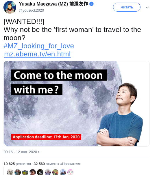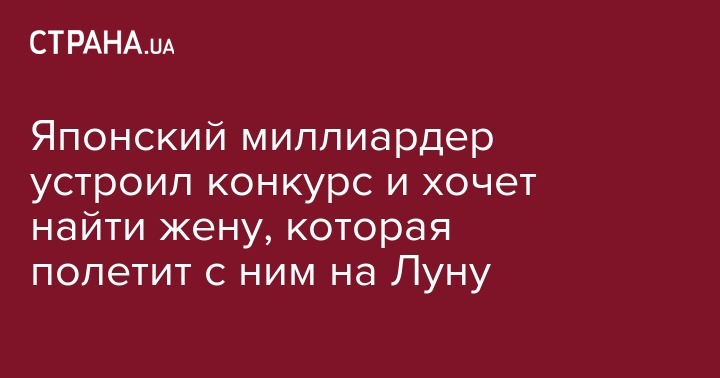 Японский 44-летний миллиардер Юсаку Маэдзава объявил конкурс для девушек, которые готовы стать его женой и полететь с ним на Луну. Его проект называется "сватовство для серьезных отношений один на один". Об этом он написал в Twitter.
