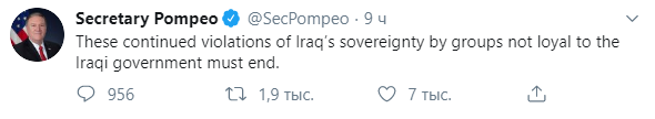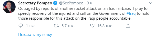 "Возмущен сообщениями о новом ракетном обстреле иракской авиабазы. Я молюсь за скорейшее выздоровление раненых и призываю правительство Ирака привлечь к ответственности виновных в этом нападении на иракский народ. Эти длительные нарушения суверенитета Ирака группами, которые не поддерживают иракское правительство должны прекратиться", - написал Помпео.