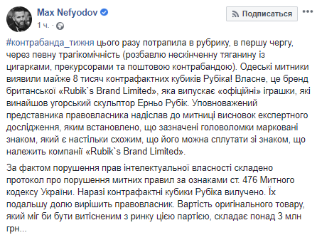 "По факту нарушения прав интеллектуальной собственности составлен протокол о нарушении таможенных правил по признакам ст. 476 Таможенного кодекса Украины. Сейчас 7,8 тыс. контрафактных кубиков Рубика изъяты. Их дальнейшую судьбу решит правообладатель", – написал Нефедов.