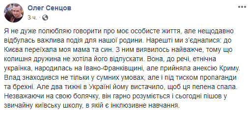 "Я не очень люблю говорить о моей личной жизни, но недавно произошло важное событие для нашей семьи. Наконец-то, мы воссоединились: в Киев переехала моя мама и сын", - сообщил Олег Сенцов в Facebook.