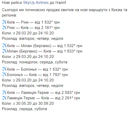 Также с 29 марта по 24 октября будет осуществляться рейс по маршруту Киев-Милан (Бергамо). Он будет выполняться три раза в неделю – по понедельникам, средам и субботам. Стоимость билета из Киева в Милан стартует от 1,5 тыс. грн, в обратную сторону – от 1,6 тыс. грн.