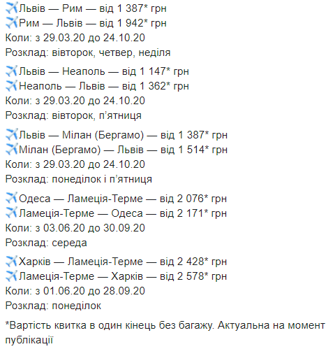 Рейс Киев – Ламеция-Терме – Киев будет выполняться с 30 мая по 30 сентября 2020 года два раза в неделю – по средам и субботам. Стоимость билета из Киева в Ламерцию-Терме стартует от 2,1 тыс. грн, в обратную сторону– от 2,3 тыс. грн.