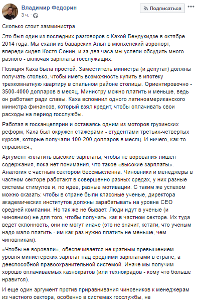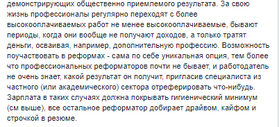 И еще один аргумент против приравнивания чиновников к менеджерам из частного сектора, особенно в системах госслужбы, не демонстрирующих общественно приемлемого результата. За свою жизнь профессионалы регулярно переходят с более высокооплачиваемых работ не менее высокооплачиваемые, бывают периоды, когда они вообще не получают доходов, а только тратят деньги, осваивая, например, дополнительную профессию. Возможность поучаствовать в реформах - сама по себе уникальная опция, тем более что профессиональных реформаторов почти не бывает, и работодатель не очень знает, какой результат он получит, пригласив специалиста из частного (или академического) сектора отреферировать что-нибудь. Зарплата в таких случаях должна покрывать гигиенический минимум (см выше), все остальное реформатор добирает драйвом, кайфом и строчкой в резюме", - написал экс-главред украинской версии журнала Forbes Владимир Федорин.