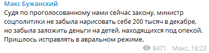 "Судя по проголосованному нами сейчас закону, министр соцполитики не забыла нарисовать себе 200 тысяч в декабре, но забыла заложить деньги на детей, находящихся под опекой.