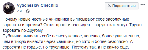 "Почему новые честные чиновники выписывают себе заоблачные зарплаты и премии? Ответ прост и очевиден – воруют как могут. Трусят воровать по-другому. Публично выписать себе незаслуженное, конечно, более унизительно, чем в тихую вывести через "вышки", но зато и более безопасно. А соросята не гордые, но трусливые. Поэтому так, а не как-то еще" - написал журналист Вячеслав Чечило.