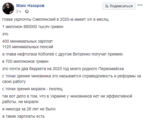 "глава укрпочты Смелянский в 2020-м имеет з/п в месяц