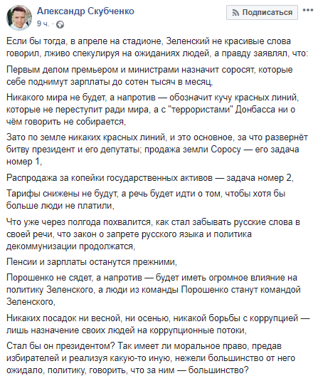 Стал бы он президентом? Так имеет ли моральное право, предав избирателей и реализуя какую-то иную, нежели большинство от него ожидало, политику, говорить, что за ним — большинство?" - спрашивает глава Жилищного союза Украины Александр Скубченко.