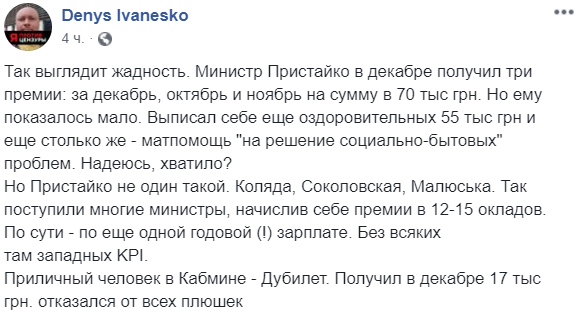 "Так выглядит жадность. Министр Пристайко в декабре получил три премии: за декабрь, октябрь и ноябрь на сумму в 70 тыс грн. Но ему показалось мало. Выписал себе еще оздоровительных 55 тыс грн и еще столько же - матпомощь "на решение социально-бытовых" проблем. Надеюсь, хватило?