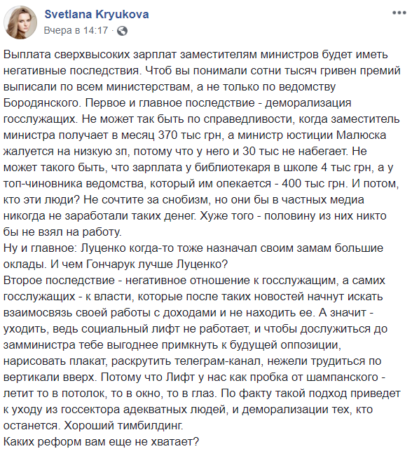 "Выплата сверхвысоких зарплат заместителям министров будет иметь негативные последствия. Чтоб вы понимали сотни тысяч гривен премий выписали по всем министерствам, а не только по ведомству Бородянского. Первое и главное последствие - деморализация госслужащих. Не может так быть по справедливости, когда заместитель министра получает в месяц 370 тыс грн, а министр юстиции Малюска жалуется на низкую зп, потому что у него и 30 тыс не набегает. Не может такого быть, что зарплата у библиотекаря в школе 4 тыс грн, а у топ-чиновника ведомства, который им опекается - 400 тыс грн. И потом, кто эти люди? Не сочтите за снобизм, но они бы в частных медиа никогда не заработали таких денег. Хуже того - половину из них никто бы не взял на работу.