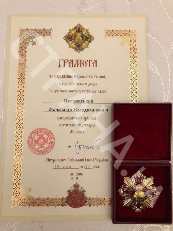 Днепровский бизнесмен и авторитет Александр Петровский (известный по прозвищу "Нарик"), который стоял во время церемонии по подписанию Томоса об автокефалии рядом с президентом Петром Порошенко, получил грамоту от предстоятеля ПЦУ митрополита Епифания. Об этом "Стране" стало известно со своих источников.