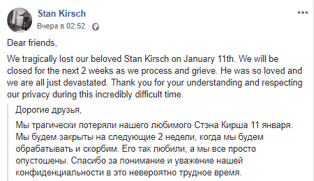 "Мы трагически потеряли нашего дорогого Стэна Кирша 11 января", - говорится в посте.