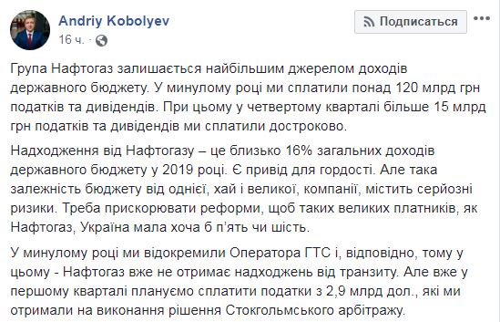"Группа Нафтогаз остается крупнейшим источником доходов государственного бюджета. В прошлом году мы заплатили более 120 млрд грн налогов и дивидендов. При этом в четвертом квартале более 15 млрд грн налогов и дивидендов мы оплатили досрочно. Поступления от Нафтогаза - это около 16% общих доходов государственного бюджета в 2019 году", - отмечает Коболев.
