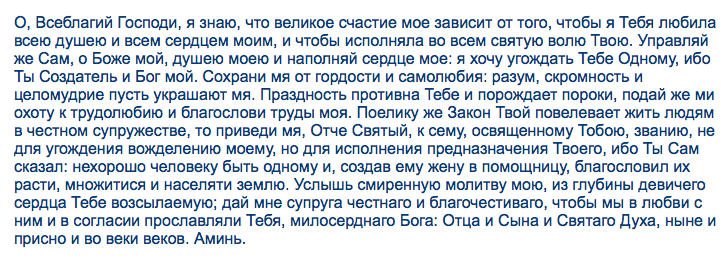 Девушки, которые хотят поскорее обрести счастье в личной жизни и выйти замуж, могут об этом молиться. Церковь не выступает против, поскольку приветствует христианский брак и считает, что у Господа и святых можно просить то, что нужно человеку.