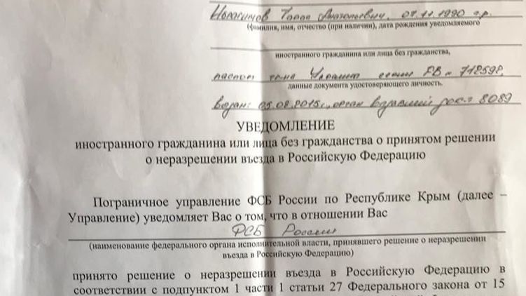 Теперь журналист не сможет приехать в Крым до 31 мая 2054 года. По данным крымских СМИ, в качестве основания запрета в погранслужбе РФ сослались на норму федерального закона №27 "О порядке выезда из РФ и въезда в РФ", которая определяет запрет на въезд в Россию, "в целях обеспечения обороноспособности или безопасности государства, либо общественного порядка, либо защиты здоровья населения".