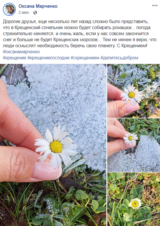 "Дорогие друзья, еще несколько лет назад сложно было представить, что в Крещенский сочельник можно будет собирать ромашки... погода стремительно меняется, и очень жаль, если у нас совсем закончится снег и больше не будет Крещенских морозов... Тем не менее я верю, что люди осмыслят необходимость беречь свою планету. С Крещением!", - написала Марченко в Facebook.