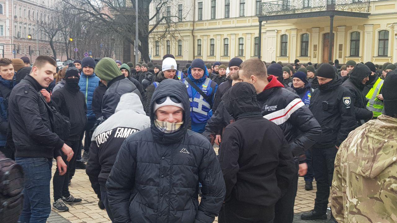 Спикер акции в мегафон скандирует "Прочь фашизм! Прочь капитализм", а также "Права человека - будущее Украины". Охрану порядка обеспечивают несколько десятков правоохранителей. Участников акции силовики взяли в кольцо оцепления.