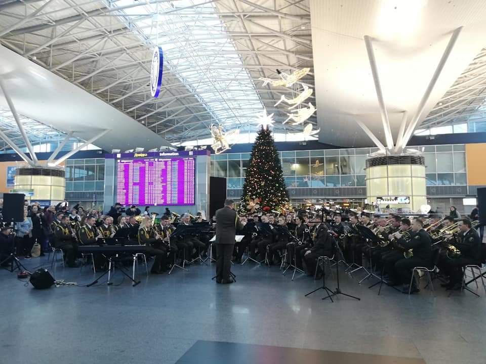 В терминале "D" киевского аэропорта "Борисполь", 20 января, в честь Дня памяти защитников Донецкого аэропорта состоялось выступление Национального президентского оркестра и хора Ансамбля песни и танца Вооруженных Сил Украины.