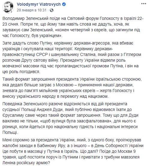 Отметим, что на Ближний Восток Зе поехал уже вечером 22 января - после выступления на форуме в швейцарском Давосе. К поездке на день соборности в Швейцарию Вятрович никаких претензий не имел - видимо, имея на Израиль какой-то особенный зуб.