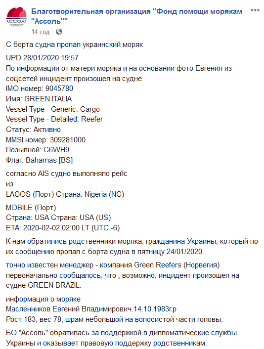 "С борта судна пропал украинский моряк. По информации от матери моряка и на основании фото Евгения из соцсетей инцидент произошел на судне: