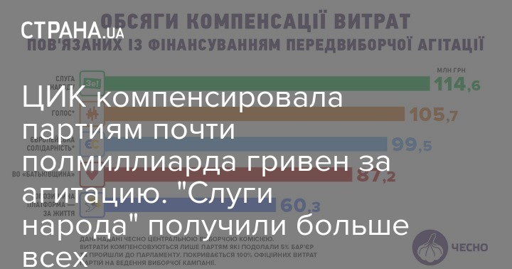 ЦИК компенсировала затраты политпартий на предвыборную агитацию. Больше всего получила партия "Слуга народа" - почти 115 миллионов гривен. Совокупная сумма компенсации составляет 467,3 миллиона гривен.