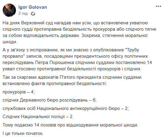 Головань пишет, что, основываясь на жалобах адвокатов, судьи установили факты противоправной бездеятельности у прокуроров - 4 случая; следователей ГБР - 6 случаев; должностных лиц НАБУ - 2 случая; следователей Нацполиции - 2.