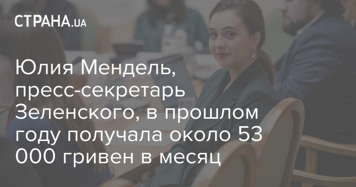 Пресс-секретарь президента Украины Юлия Мендель за семь месяцев 2019 года получила около 370,5 тысяч гривен зарплаты, то есть ежемесячно она зарабатывала примерно по 53 000 грн.
