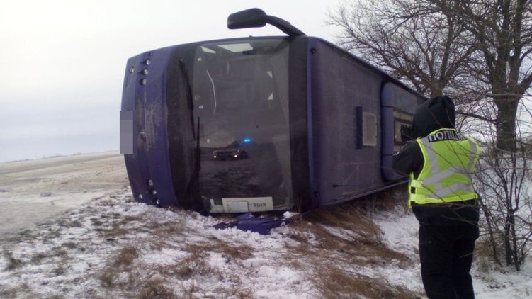 Водитель рейсового автобуса Одесса-Киев из-за сложных погодных условий потерял контроль над транспортом из-за скользкой дороги. В перевернувшемся автобусе находилось 19 человек, двое из которых - 37 летняя женщина и 9-летний ребенок - получили телесные повреждения. Об этом сообщает пресс-служба правоохранителей в Одесской области.