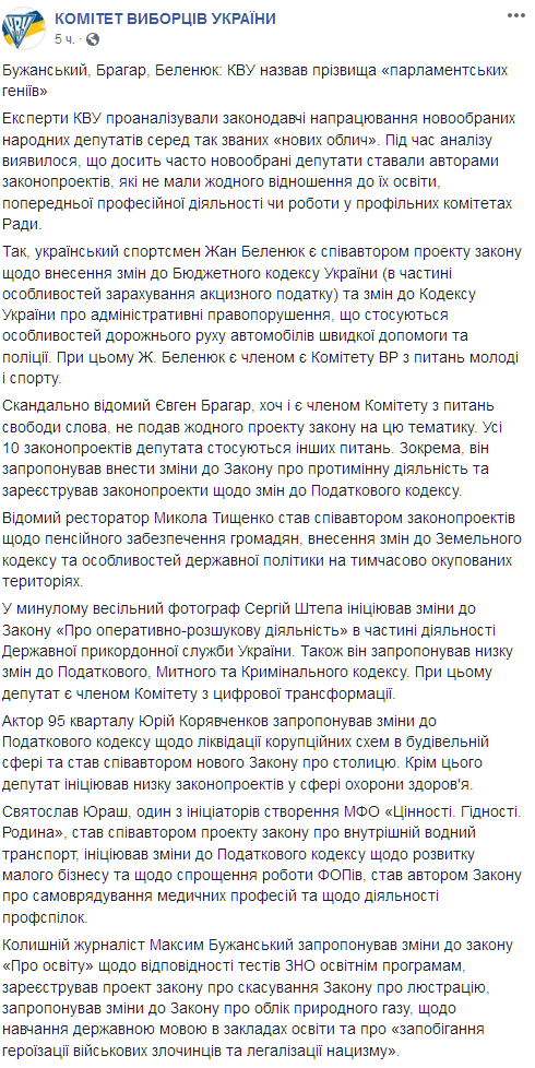 А вот парламентарий Евгений Брагар который является членом комитета по вопросам свободы слова, не подал ни одного законопроекта. Все 10 проектов закона, к которым он причастен, касаются совершенно других вопросов. К примеру, он предложил внести изменения в закон о противоминной деятельности и зарегистрировал законопроекты относительно изменений в Налоговый кодекс.