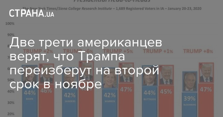 Согласно исследованию, 66% американцев ожидают победы Трампа на выборах в ноябре 2020 года. При этом 27% полагают, что Трамп определенно победит, а 39% - что вероятно. Лишь 22% говорят, что он, возможно, проиграет демократу, и только 6% - что обязательно проиграет.