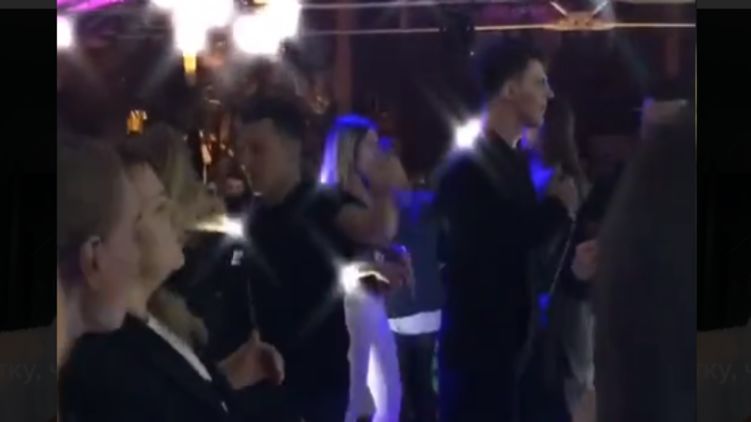 Действия разворачиваются, судя по всему, в клубе или ресторане. Владимир Зеленский в черной футболке и джинсах активно двигается под музыку: прыгает, поднимает руки и, очевидно, получает удовольствие от происходящего. Рядом с ним танцуют и другие люди, а напротив находится, скорее всего, его супруга Елена.