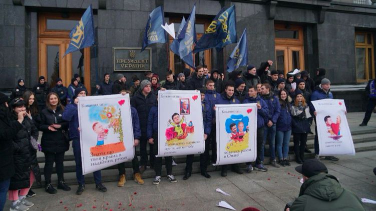 Нацкорпус пришел на Банковую с плакатом "Love is прятаться вместе в Омане" и фото Зеленского с Патрушевым