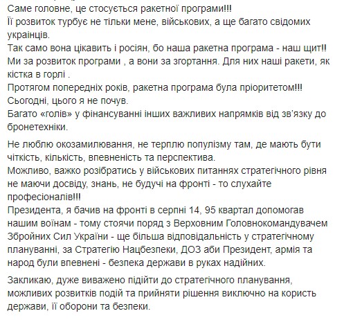 "Принятие его в таком виде приведет к срыву ключевых оборонных программ и инициатив, что в дальнейшем может привести к ослаблению нашей обороноспособности вместо наращивания. Самое главное, это касается ракетной программы. Она инетересует россиян. Мы за развитие программы, а они за свертывание. Для них наши ракеты, как кость в горле. В течение предыдущих лет ракетная программа была приоритетом. Сегодня этого я не услышал", - объяснил Кривонос.