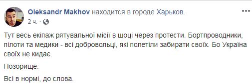 Также он сообщил, что весь экипаж спасательной миссии в шоке из-за протестов, так как бортпроводник, пилоты и медики - все добровольцы, полетели забирать своих - "потому что Украина своих не бросает". И добавил: "Позорище".