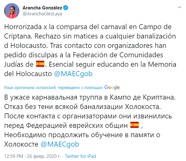 Что касается организаторов карнавала, то по данным испанского МИДа, они уже извинились перед еврейской общиной Испании и сообщили о намерениях почтить память жертв Холокоста в будущем.