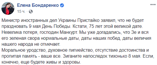 Моральное уродство, духовное пигмейство, отсутствие достоинства и пропитая память - ваше все. Зиганите напоследок тихонько 8 мая. Если, конечно, еще будете живы и здоровы", - пишет экс-депутат Елена Бондаренко.