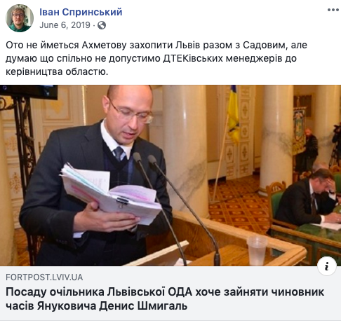 "Вот неймется Ахметову захватить Львов вместе с Садовым, но думаю, что совместно не допустим ДТЭКовских менеджеров к руководству областью", – разгонял по Facebook призывы местный активист Иван Спринский.