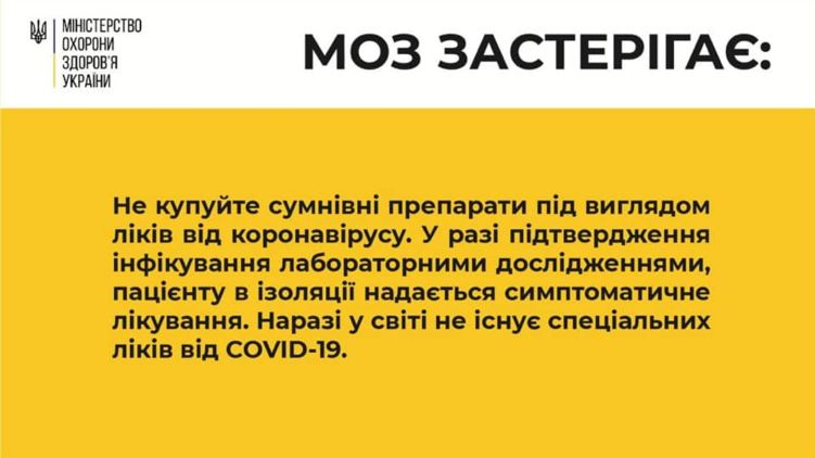 МОЗ Украины призывает украинсцев не доверять этой информации и не покупать сомнительные препараты. В случае подтверждения наличия коронавируса лабораторными исследованиями пациенту в изоляции предоставляется симптоматическое лечение. Сейчас в мире не существует специальных лекарств от Сovid-19. Будьте бдительны, не занимайтесь самолечением и при первых симптомах ОРВИ звоните семейному врачу. Врачи имеют четкий алгоритм действий на все случаи.