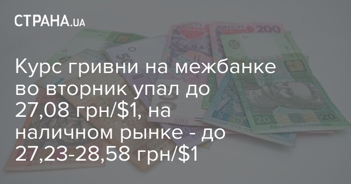 На наличном рынке курс гривни во вторник несколько снизился – до 27,23-28,58 грн/$1 (купля-продажа) с 26,58-27,48 грн/$1 в понедельник вечером.