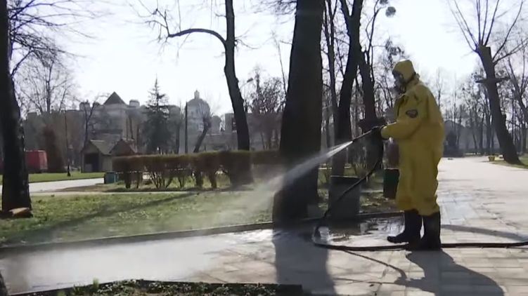 В Белой Церкви улицы и остановки обрабатывают специальным дезинфицирующим раствором. В мероприятиях по противодействию коронавирусу приняли участие спасатели.