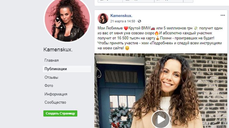 В Facebook мошенники разводят украинцев от имени Каменских, Дорофеевой и Седоковой. Скриншот: Facebook/ Kamenskux.