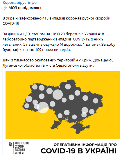 В Украине по состоянию на утро 29 марта зафиксировано 418 случаев коронавируса. При этом у 109 пациентов инфекция была обнаружена за последние сутки.