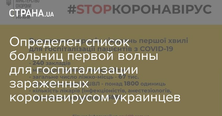 Главы областных государственных администраций, Министерство охраны здоровья и Национальная служба здоровья Украины здрава и НСЗУ определили перечень больниц первой волны для госпитализации пациентов с коронавирусной инфекцией COVID-19.