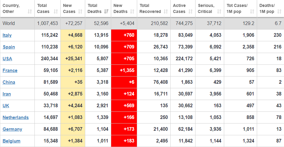 Всего в мире 1,007,453 заболевших, 210,582 человек уже вылечились, активных случаев болезни еще 744,275.