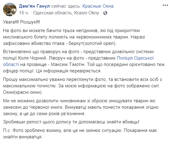 Фотографию, где полицейские позируют с застреленным беркутом (золотым орлом) в социальных сетях разместил лидер общественного движения "Уличный фронт" Демьян Ганул. Трое мужчин в камуфляжной одежде держат за крылья большого орла. В руках мужчин – ружья, рядом – охотничьи собаки. Ганул заявил, что эти люди, "под прикрытием" охотничьего билета охотятся на краснокнижных животных. "Установлено, что справа на фото - представитель разрешительной системы полиции Коля Черный. Слева на фото - представитель полиция Максим Тимотин. Тот, что в центре предположительно тоже офицер полиции. Эта информация проверяется", - заявил активист. По его данным, фотография сделана в поселке Окны. Как отметил известный эколог Иван Русев, по предварительным данным, на фотоснимке – сотрудник Окнянского отделения полиции Подольского отдела полиции Максим Тимотин, инспектор по контролю за оборотом оружия в сфере разрешительной системы этого же полицейского отделения и руководитель одного из РЭС компании "Одессаоблэнерго" Андрей Ляцкий.